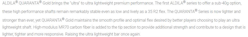 Description Videos Hide Videos Show Videos brand: Aldila SKU: aldila-quaranta-gold-55-shaft-AL Add to Wishlist Create New Wishlist