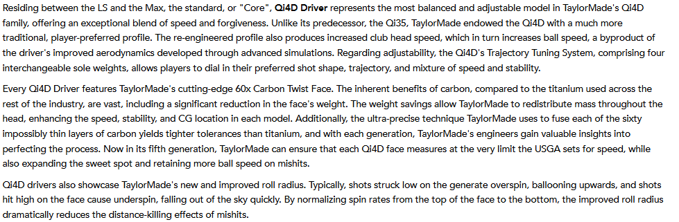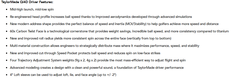 item specs Description Videos Hide Videos Show Videos brand: TaylorMade SKU: 199010726000 Model: Qi4D Club Type: Driver Condition: New Condition Rating: 10 out of 10 Gender: Men Shaft Brand: TaylorMade Shaft Material: Graphite Length: 45.75" Grip: TaylorMade Headcover: Included Add to Wishlist Create New Wishlist