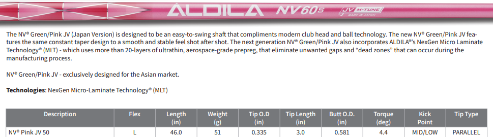 Aldila NV Pink JV 50 Lite Flex Graphite Shaft w/ Adapter and Grip