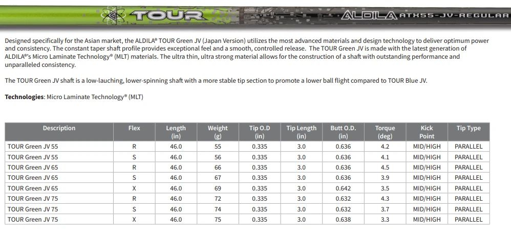 Aldila Tour Green JV Graphite Shaft w/ Adapter and Grip
