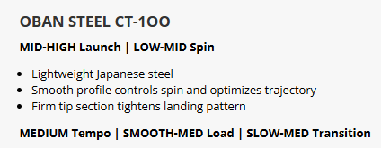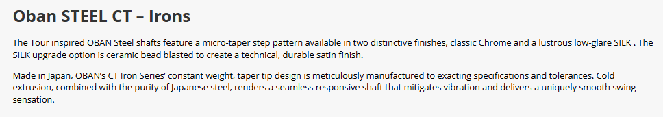 Description Videos Hide Videos Show Videos SKU: oban-ct-silk-iron-shafts Add to Wishlist Create New Wishlist