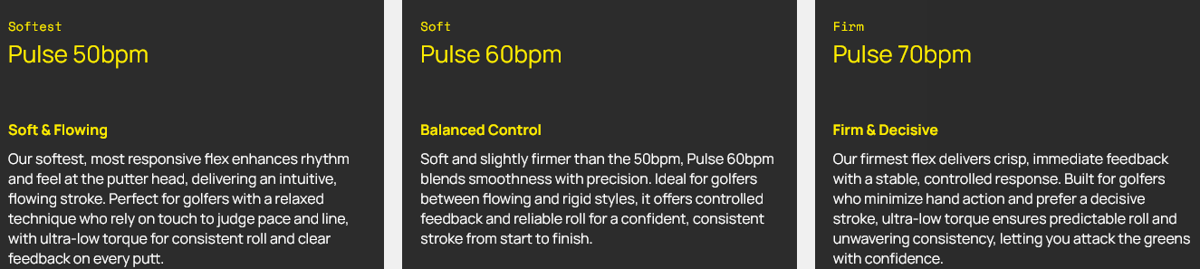 item specs Description Videos Highlights of the Pulse Putter shafts Three distinct models with a unique flex and feel High Performance and Consistency Ultra-Low Torque at under 1° Automated no-human-error manufacturing process Videos Hide Videos Show Videos The Most Advanced Putter Shaft Ever Made | TPT PULSE Changes Everything No putter shaft has ever offered this level of feel without sa... brand: TPT SKU: tpt-pulse Condition: New Add to Wishlist Create New Wishlist